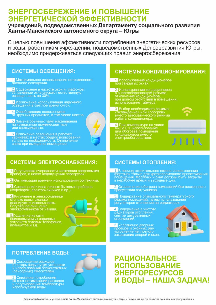 С целью повышения эффективности потребления энергетических ресурсов и воды, работникам учреждений, подведомственных Депсоцразвития Югры, необходимо придерживаться следующих правил энергосбережения: