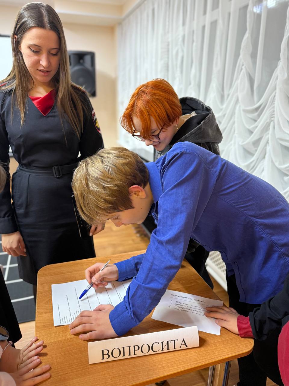 Лейтенант полиции Ангелина Ильдаровна ждала ребят на станции «Вопросита», на которой они отвечали на вопросы по правам и обязанностями детей.