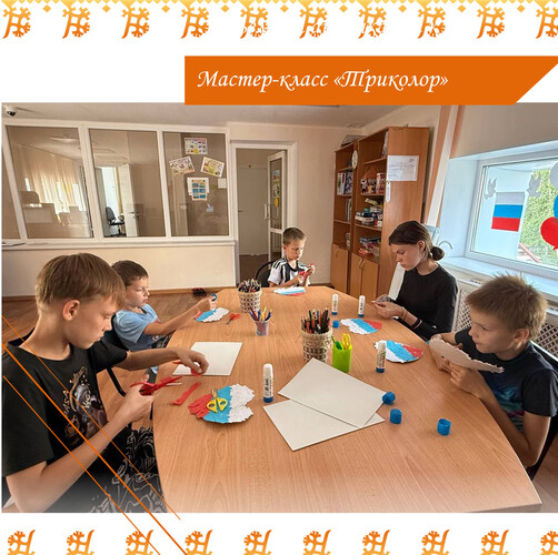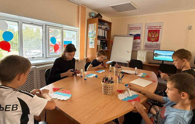 В преддверии Дня Государственного флага России с воспитанниками летней оздоровительной смены прошел мастер-класс «Триколор». Ребята с увлечением вырезали из картона основу для своих поделок и подготовили бумажные цветы в цветах российского флага — белом, синем и красном, которые затем аккуратно приклеили на основу.