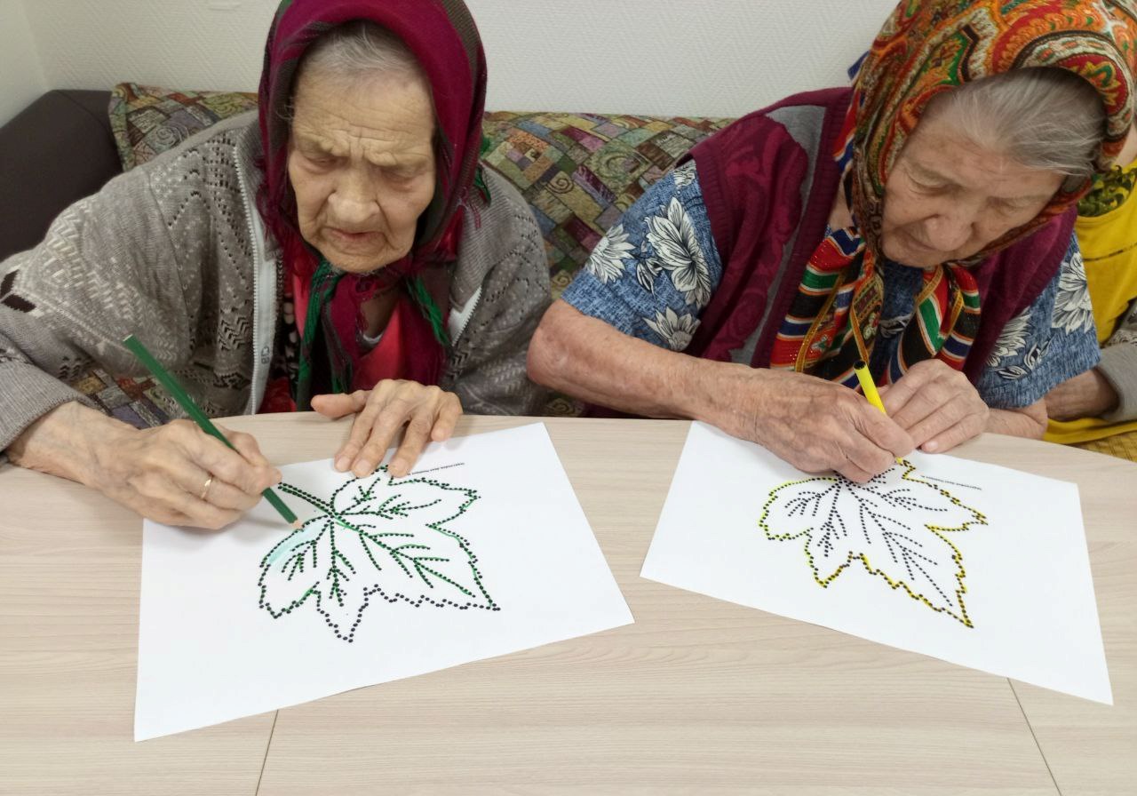 Тема занятия — изображение листа дерева. Пожилые люди с огромным энтузиазмом приступили к работе, старательно наносили яркие точки, которые затем раскрасили.Психолог внимательно наблюдала за процессом, оказывала поддержку и подбадривала участников.